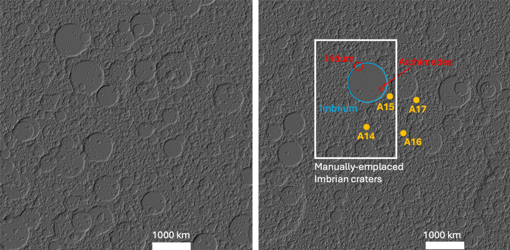 The image on the left is what a normal CTEM simulation looks like, and the image on the right is one of my simulations. The emplacement of large basins like Imbrium allows the simulated surface to resemble that of the actual Moon. I can then track the source craters of impact melt at pixels corresponding to the Apollo 14-17 landing sites. For this study, I focused on the Imbrian period, which took place between 3 and 3.9 billion years ago.