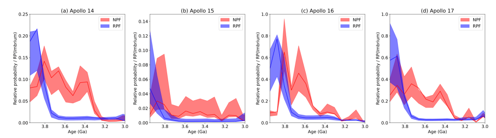 The above image shows that our model results under the RPF are a closer match to the age distribution of Imbrian Apollo impact melts than our results under the NPF! This means that the ages of Apollo impact melts support a rapid decline in impact bombardment during the Imbrian period as predicted by the RPF! Note that this does not mean the impact rate exactly followed the RPF– just that there was likely a steep decline in impact rate during the Imbrian.