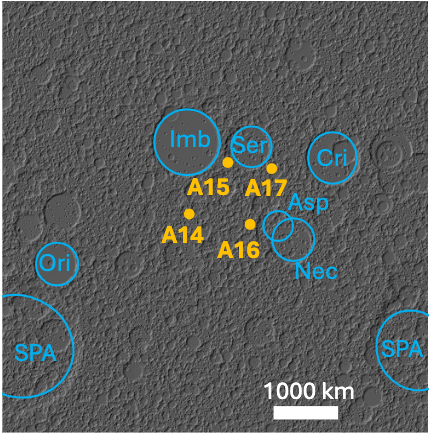 This research is applicable to more than just the Imbrian! The largest craters on the Moon are known as basins, and they were emplaced by impacts early in lunar history. We can use CTEM to model the amount of melt each basin contributes to each studied Apollo site. The image below shows the locations of several prominent basins, as well as the Apollo landing sites, on the model grid.